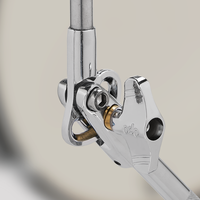 Beckenständer der Serie 800. Entworfen von Drum Workshop in Kalifornien, umfassen seine professionell inspirierten Funktionen eine variable Glide Tilter™-Position mit schnell lösbarer QR-Flügelmutter, leichte Verbundstoff-Speicherverriegelungen an allen Rohrverbindungen sowie vergrößerte rutschfeste Gummifüße.
