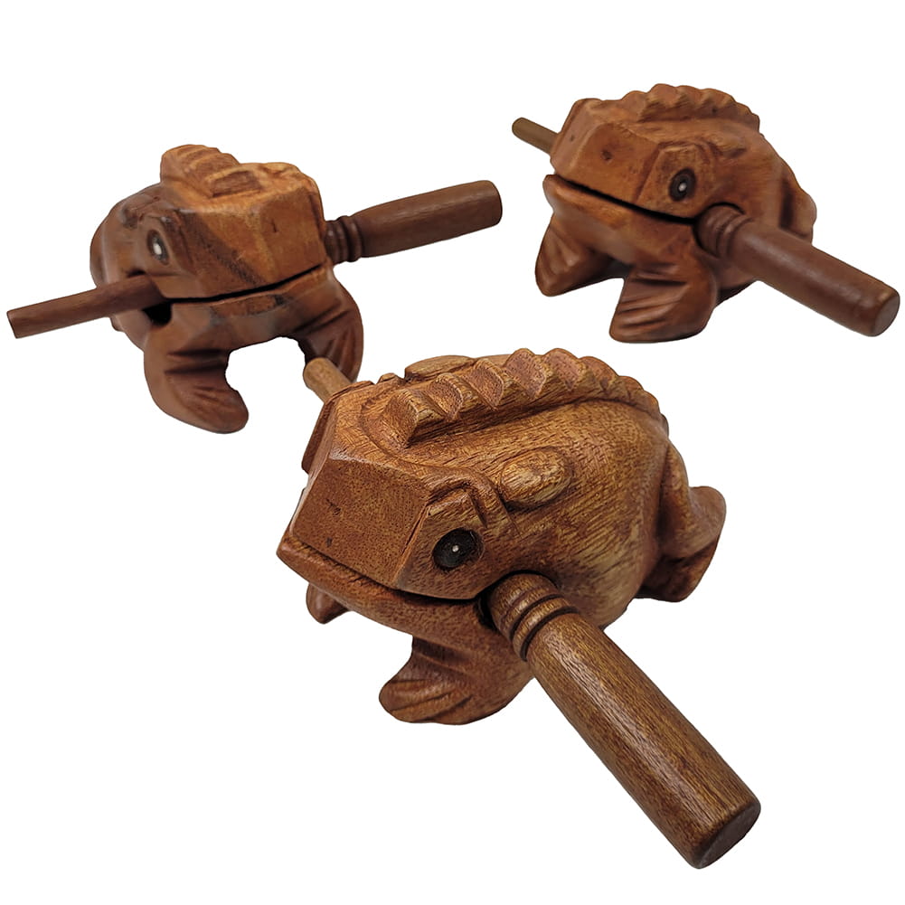 - beim Streichen mit dem Schlägel über den Rücken des Frosches entsteht ein Klang, der dem Quaken eines Frosches ähnelt