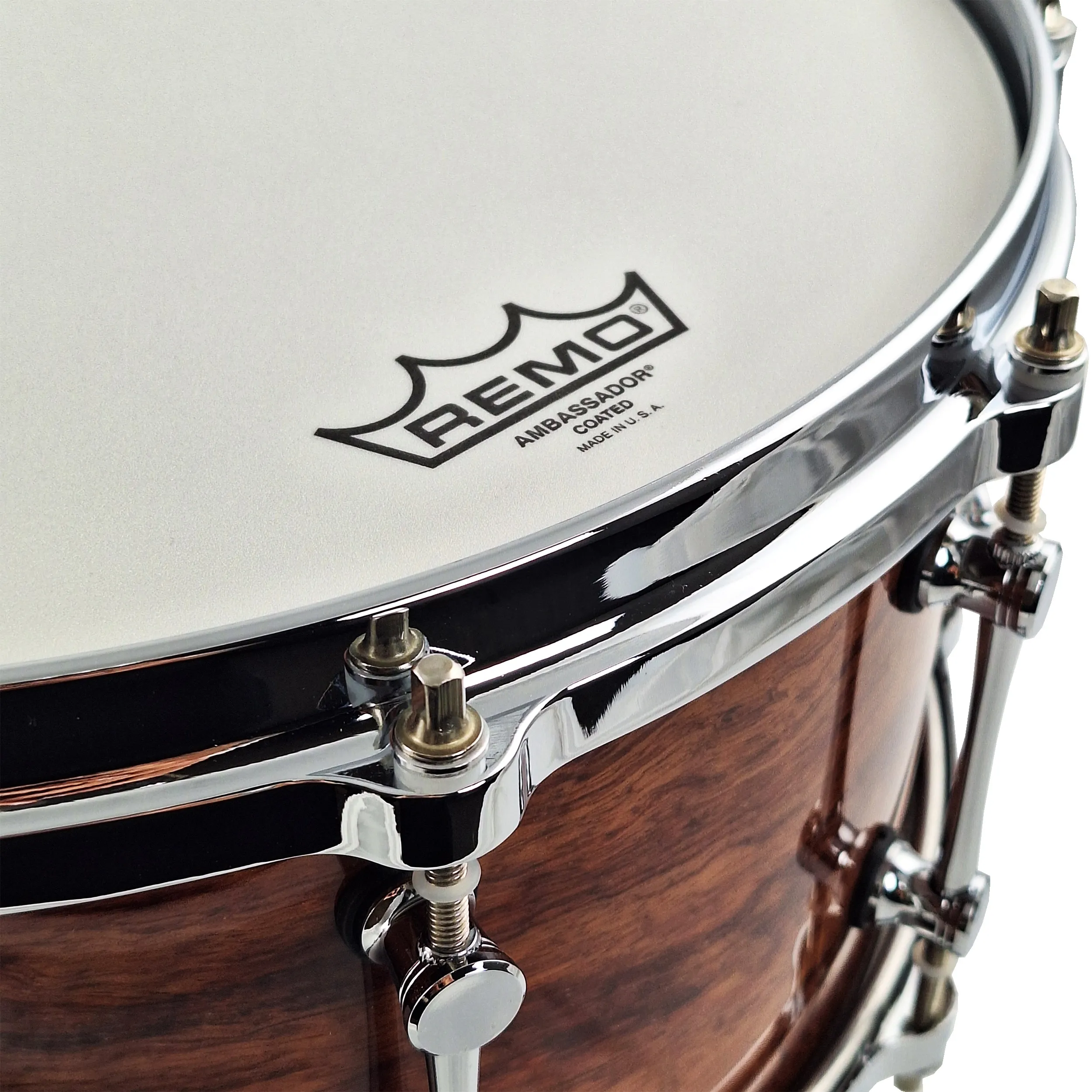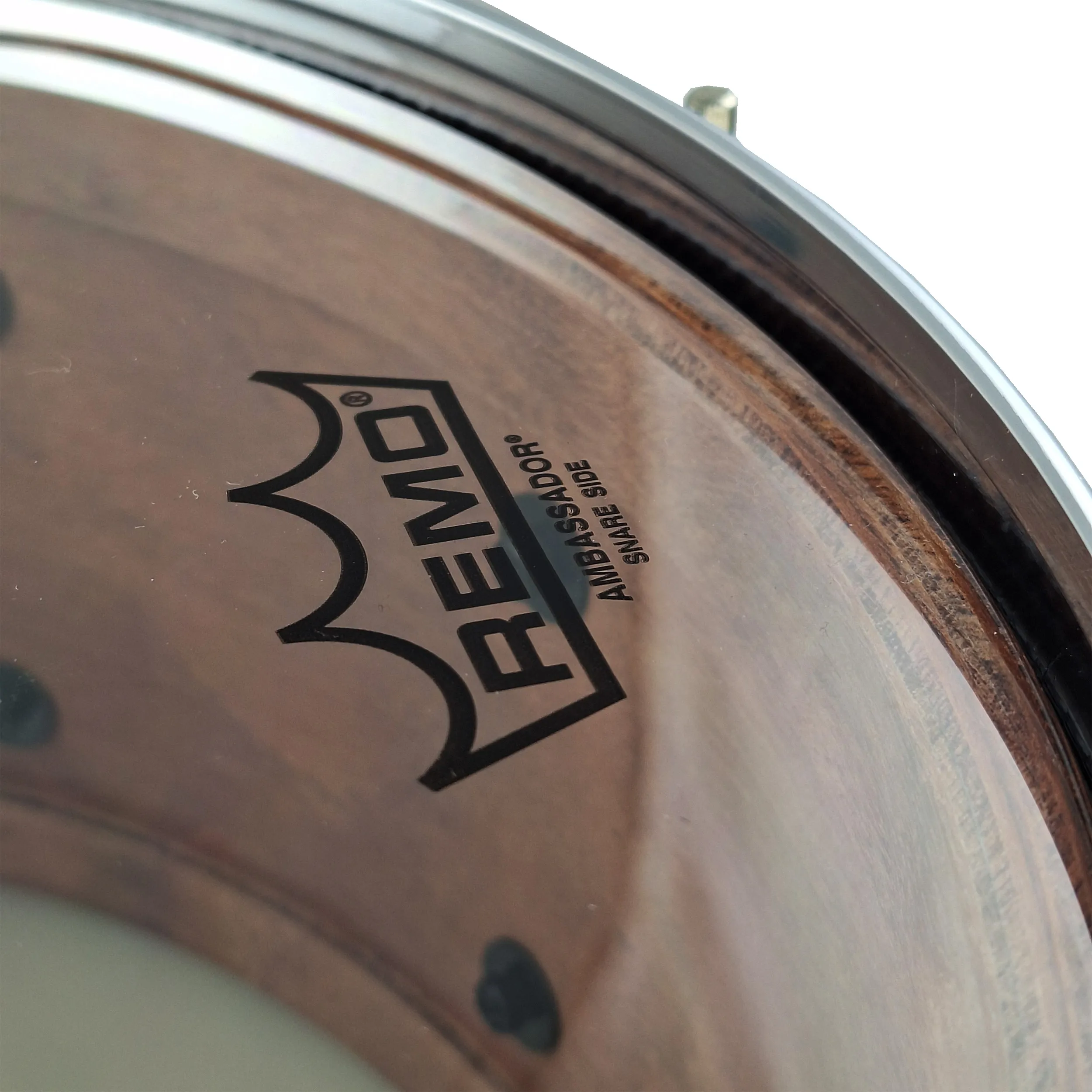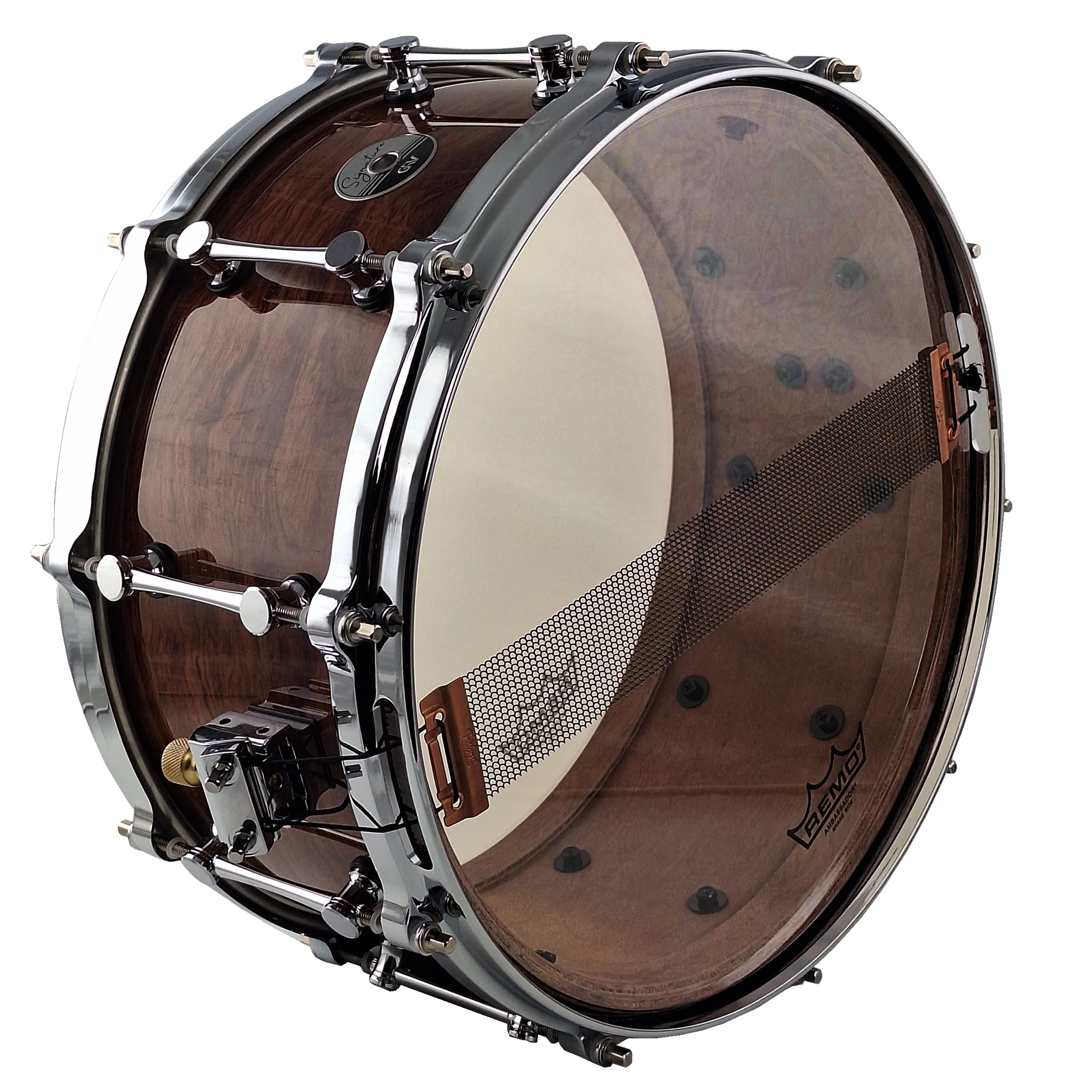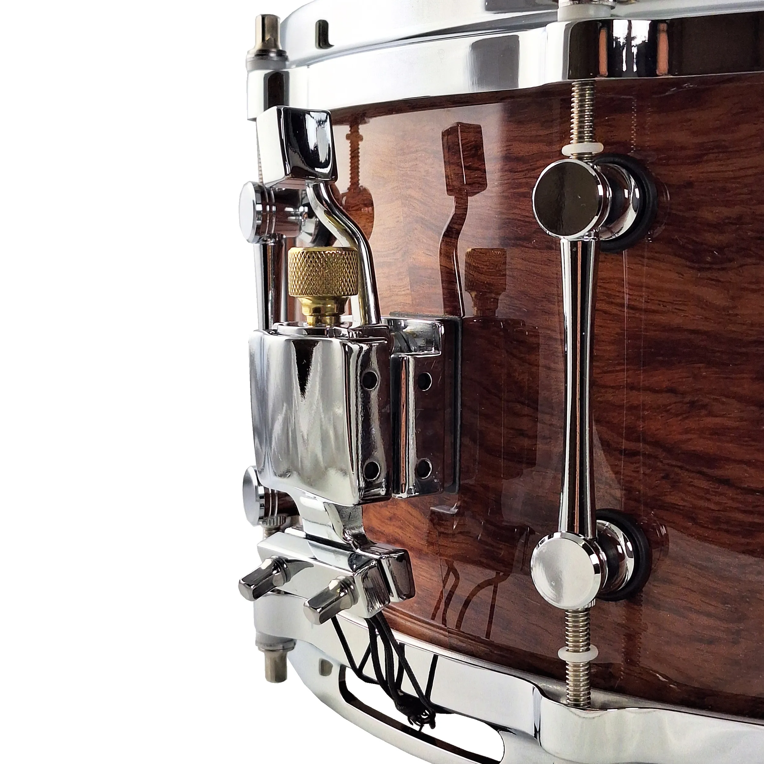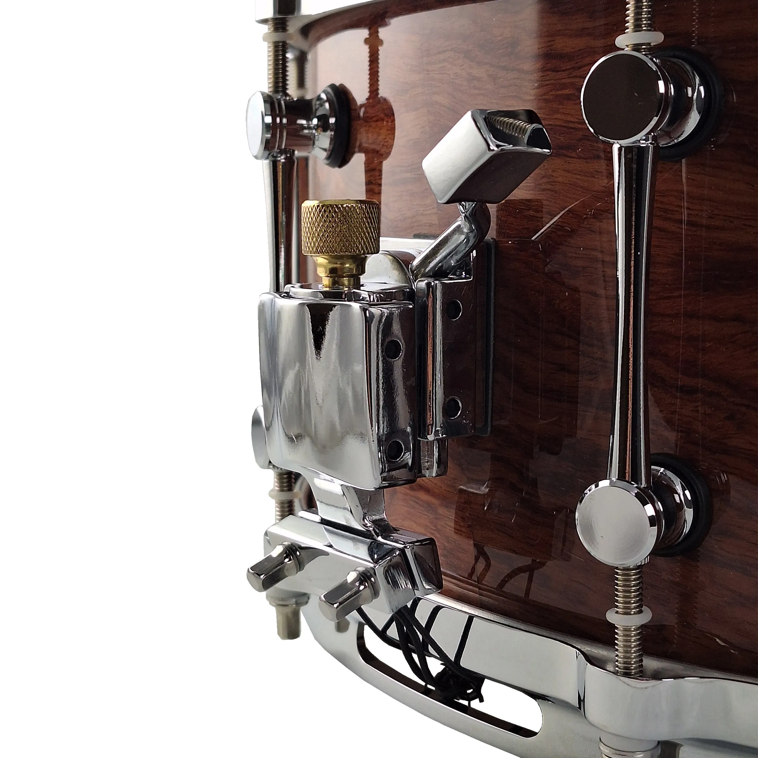 Das Herzstück dieser Snare ist ein präzise gefertigter 3-lagiger Korpus aus Bubinga mit einer Dicke von 6 mm, ergänzt durch verstärkende Spannreifen mit 4 mm Dicke. Die Kombination dieser Elemente sorgt nicht nur für außergewöhnliche Robustheit, sondern auch für einen reichen, dunklen Klang mit voller Projektion.