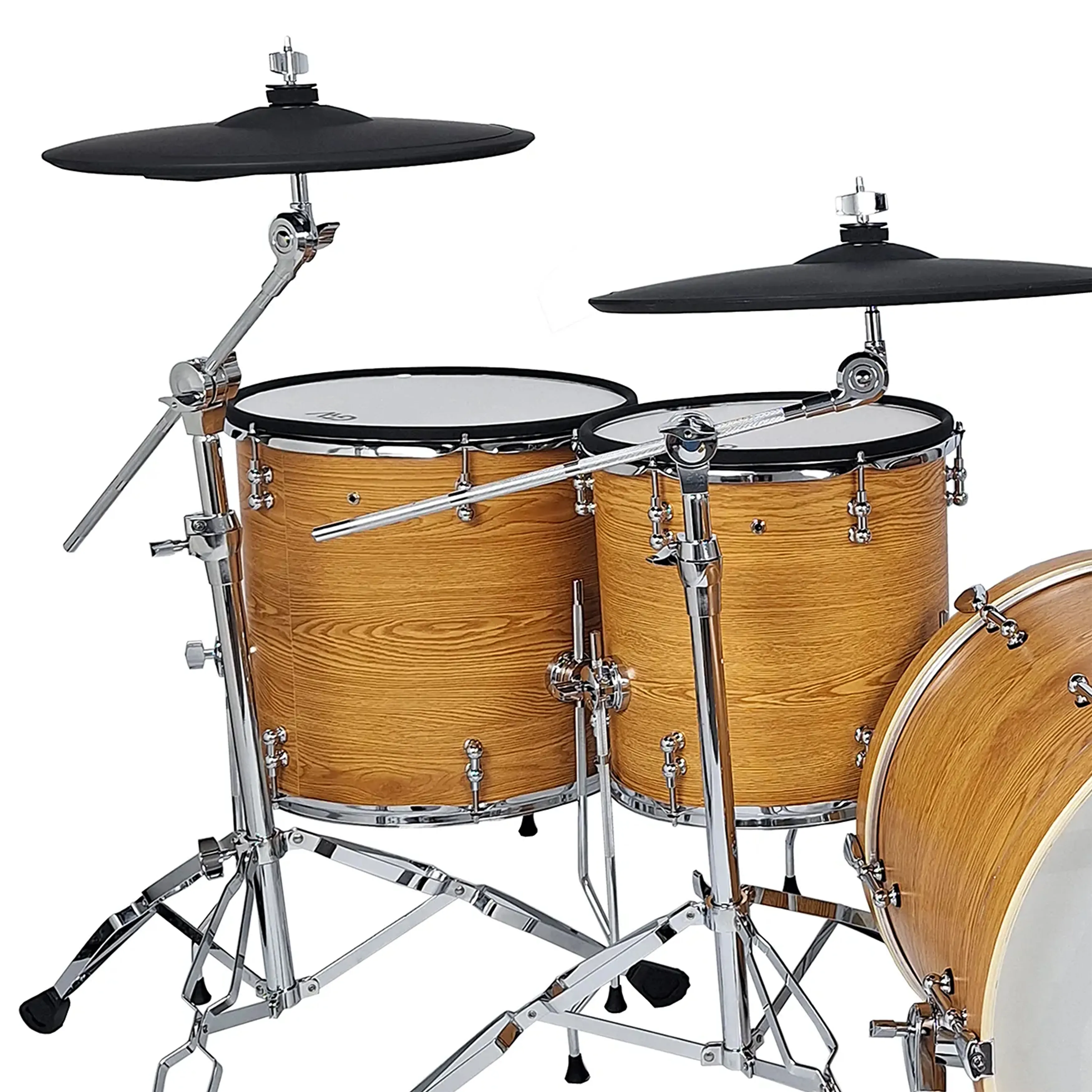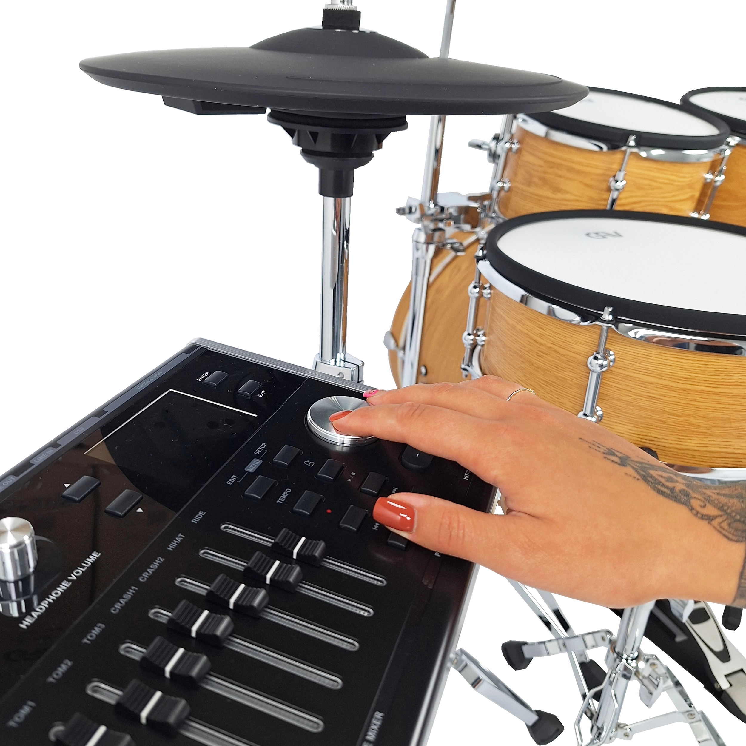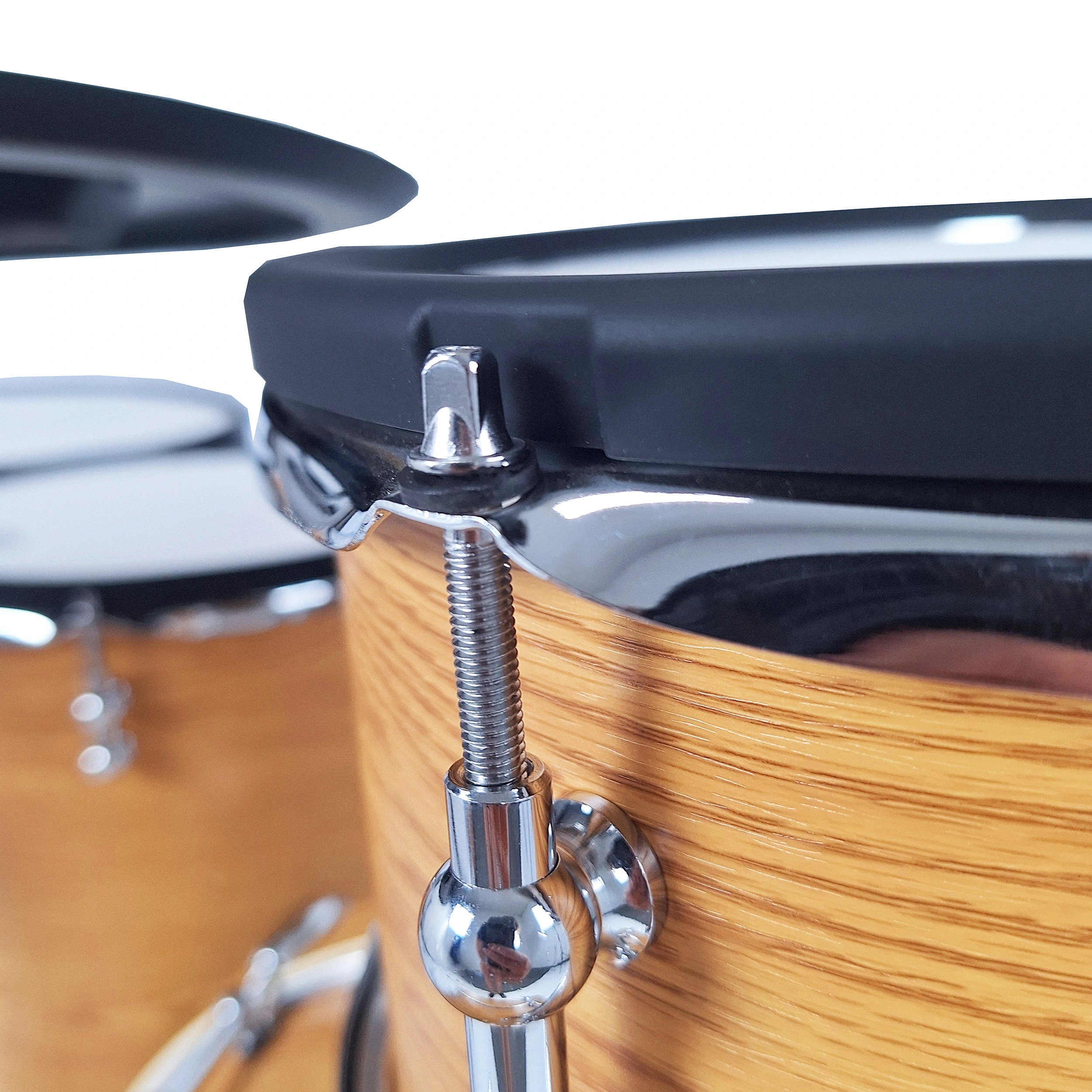 Das Set zeichnet sich vor allem durch große Trommelkessel aus, die das Spielen äußerst nah an einem akustischen Schlagzeugset gestalten. Der Einsatz von Mesh-Fellen in Kombination mit vollwertigen Toms, Snare und Bassdrum sorgt nicht nur für eine natürliche Stockrückmeldung, sondern auch für spürbaren Widerstand, der für ein authentisches Spielgefühl entscheidend ist. Diese Lösung lässt den Schlagzeuger fühlen, als würde er auf einem klassischen akustischen Set spielen.
