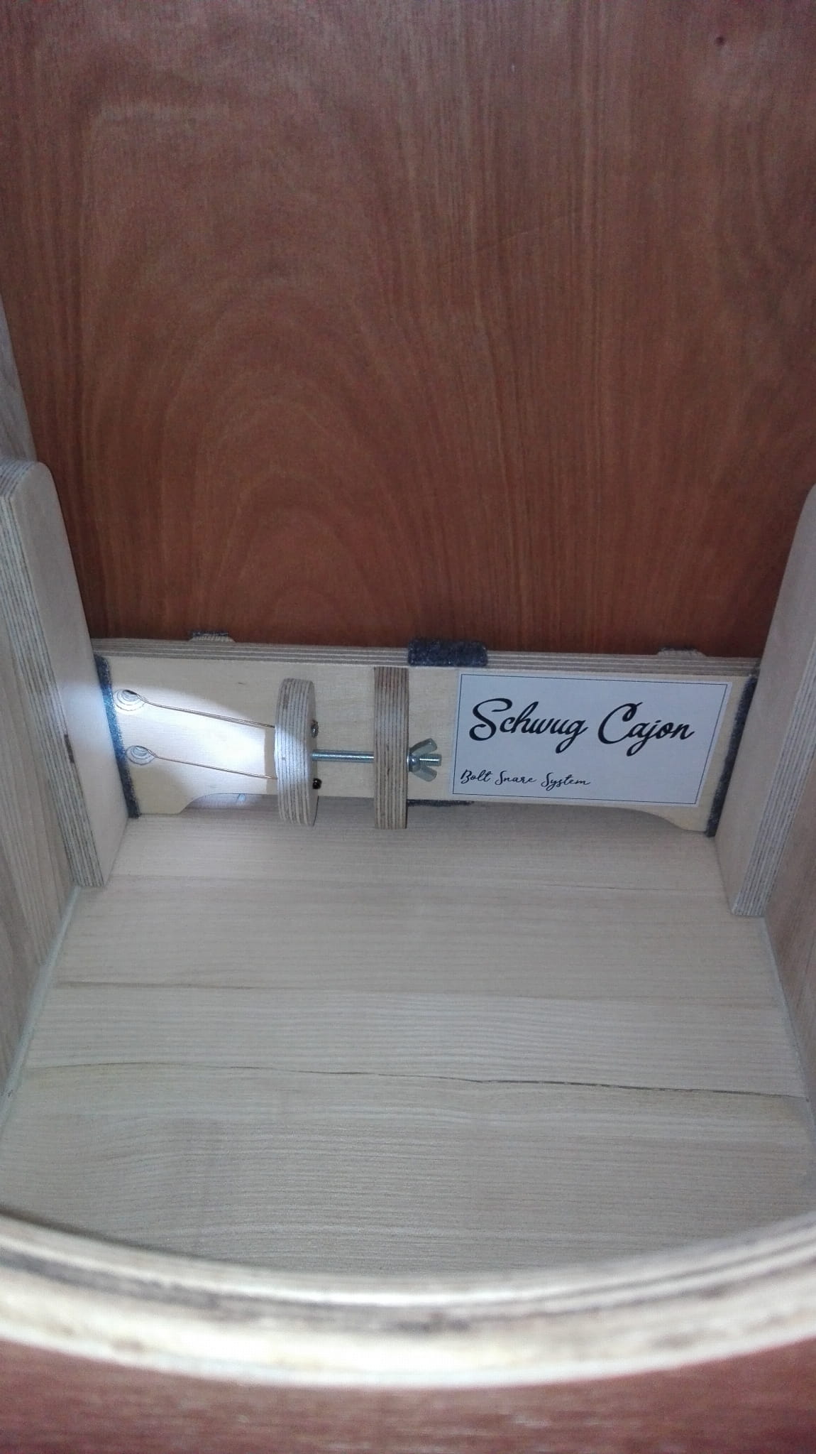 • das Cajon hat Snare-Saiten mit einstellbarer Spannung, montiert im unteren Bereich des Cajons